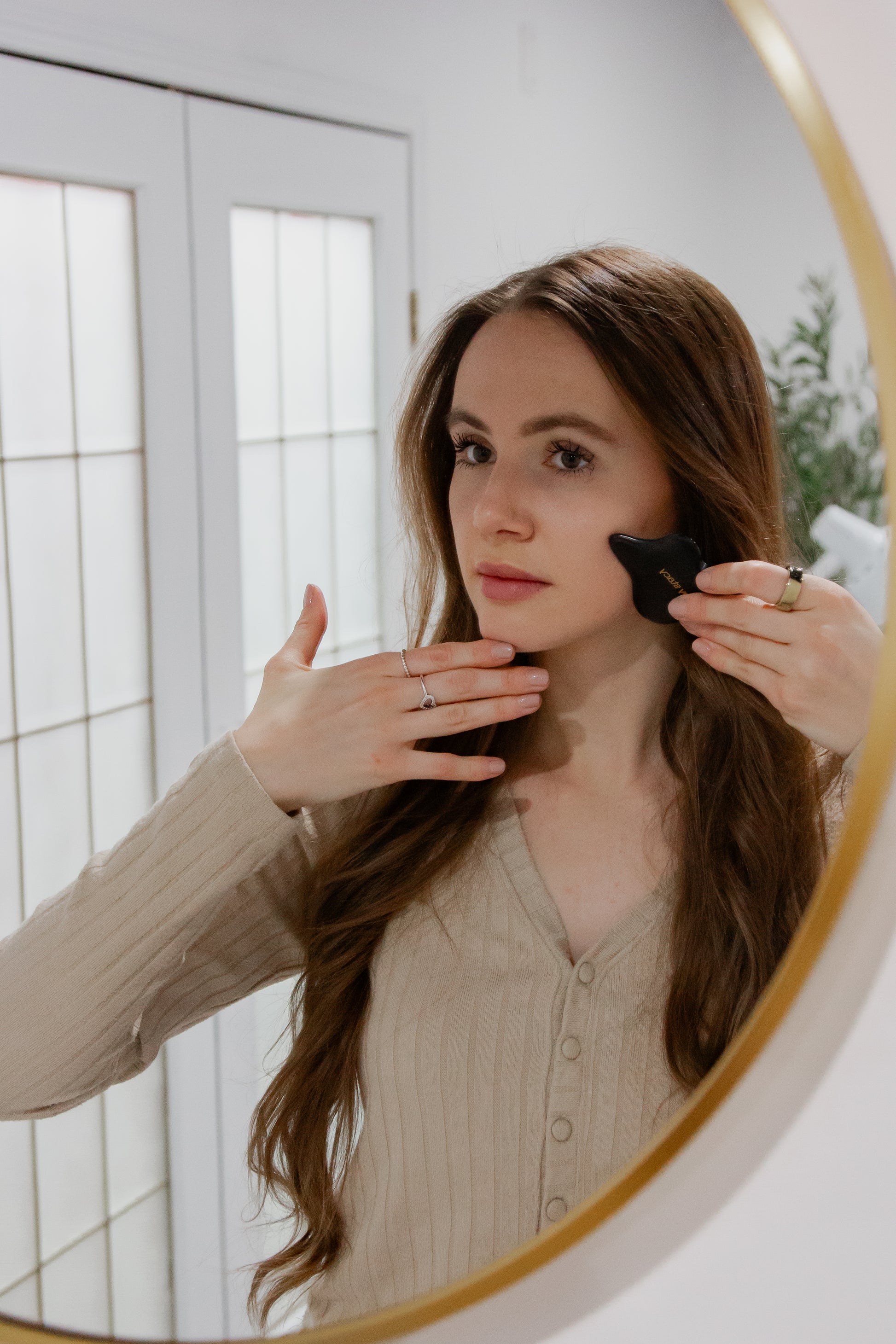 Our custom made bian gua sha tool was created with the intention of intersecting wellness & beauty through TCM. We thoughtfully designed this stone with both smooth & jagged edges to allow for a personalized gua sha ritual. Each curve is intended to hug your skin; promoting lifted, sculpted & glowing skin.